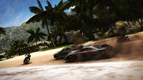Après les territoires désertiques et rocailleux du Grand Canyon, le festival MotorStorm pose ses valises sur une île inspirée d'Hawaï, dominée par des montagnes volcaniques. Entre plages de sable fin, jungle à la végétation luxuriante, grottes et cascades spectaculaires, ou encore sommets rongés par les coulées de lave, le cadre proposé par celui que l'on appelle MotorStorm II au Japon est plus varié, et tout bonnement magnifique ; le spot publicitaire français se concluait par un "Faites chauffer la gomme au paradis !" tout à fait adapté à la réalité du terrain proposé, mettant en scène des monster trucks absents de "Monument Valley". En doublant largement sa tracklist toujours mêlée de rock brut de décoffrage (de nouveau Nirvana, "QotSA" ou Slipknot, mais aussi Megadeth, In Flames, Machine Head…) et d'electro puissante et rythmée (Fatboy Slim, Qemists, Pendulum, Aphex Twin, Boys Noize, Noisia, Simian Mobile Disco…), le second volet de la jeune série s'offre une ambiance extrêmement immersive et permet à toutes celles et ceux en manque d'un jeu de course tout-terrain de s'offrir une expérience qui décoiffe. En plus de miser sur une bande son agressive, MotorStorm est une série qui nous immerge dans des courses off-road brutales, où chaque pilote est sans pitié avec l'adversité, et peut littéralement éjecter un concurrent de son véhicule en pleine course… de quoi occasionner des séquences visuellement violentes, tout du moins encore plus que dans le premier volet pour justifier un passage du PEGI 12+ au 16+ ! Une classification qui fera le yo-yo d'un épisode à l'autre, revenant au PEGI 12 sur les opus extérieurs à la PS3 uniquement par la suite.