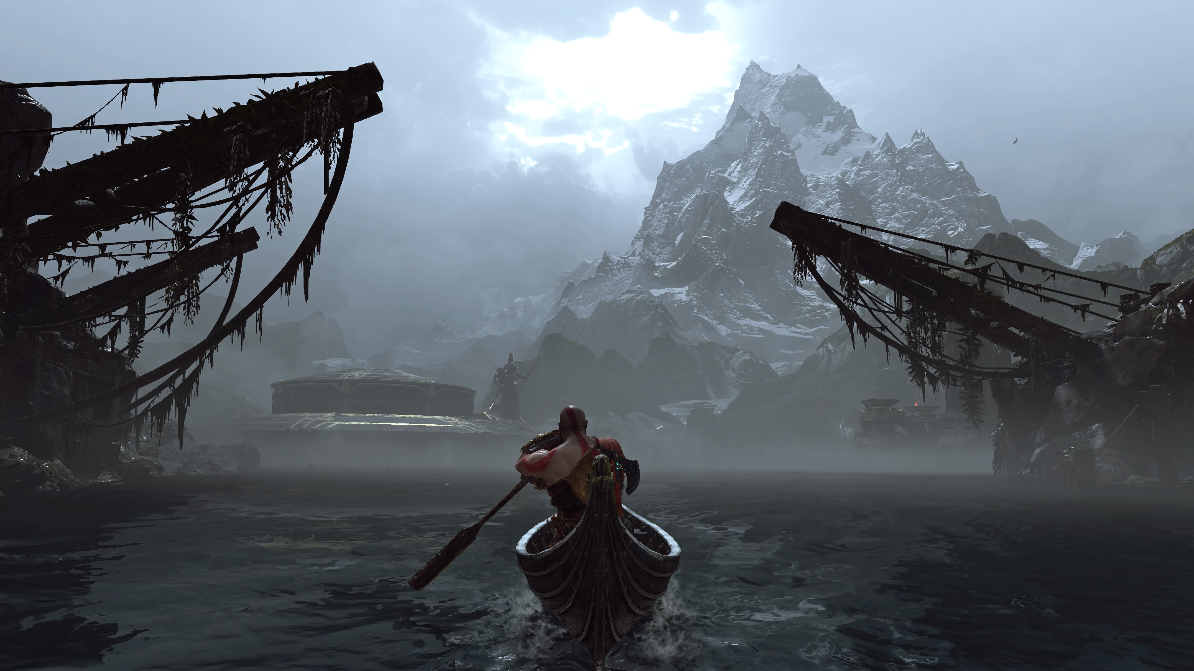 Même si on le savait, et que ce n'était pas faute de nous prévenir, l'introduction de God of War est totalement là pour perdre le joueur forgé au maniement habituel de Kratos, aux angles de caméra de la série, et à l'atmosphère bien connue de ses fans. Le fameux plan-séquence tant vendu par Sony débute dès l'écran-titre, fixé sur un arbre que notre gros bûcheron barbu va abattre à coups de hache (et de QTE) dans un accès de rage mêlé d'une surprenante mélancolie : les chœurs virils et rugueux laissent alors place à la grâce d'une harpe mélodieuse, pendant que les bandages recouvrant les bras du titan s'effilochent avant qu'il ne les replace avec une délicatesse qu'on ne lui soupçonnait pas. En sautant ensuite dans une embarcation à laquelle il attache l'arbre, en compagnie de celui que l'on devine immédiatement être son fils, Kratos nous emmène alors dans un voyage que l'on devine d'ores et déjà fantastique. Atreus – c'est le nom de son rejeton, que l'on jurerait fruit d'une union secrète avec Aloy de Horizon, de par sa maîtrise de l'arc et sa rousseur clairement pas héritée du paternel – vous fait part de son anxiété quant au comportement de l'environnement autour d'eux ces derniers temps, pendant que vous voguez en direction d'un petit quai à quelques centaines de mètres de là dans cette mystérieuse forêt. Pendant ce temps, un générique d'introduction discret affiche successivement les noms des principaux artisans de cette nouvelle création, de Cory Barlog à Bear McCreary en passant par les doubleurs, Christopher Judge en tête, et on se prend à guetter le moindre faux pas de conception de ce plan démesurément long qui s'étire sans heurts du moment qu'on ne s'aventure pas dans le menu du jeu. Il en résulte une première heure de jeu franchement palpitante et intense, bien que paraissant un peu molle du fait d'une caméra proche du personnage et dont le rythme de marche s'accomode à une lourdeur que l'on prend honnêtement plaisir à ressentir. Si l'on est davantage dans l'exploration assez linéaire au début, la promesse d'environnements semi-ouverts faite par une surprenante map et la présence de collectibles intriguent cependant encore un peu plus quant à celle du plan-séquence.